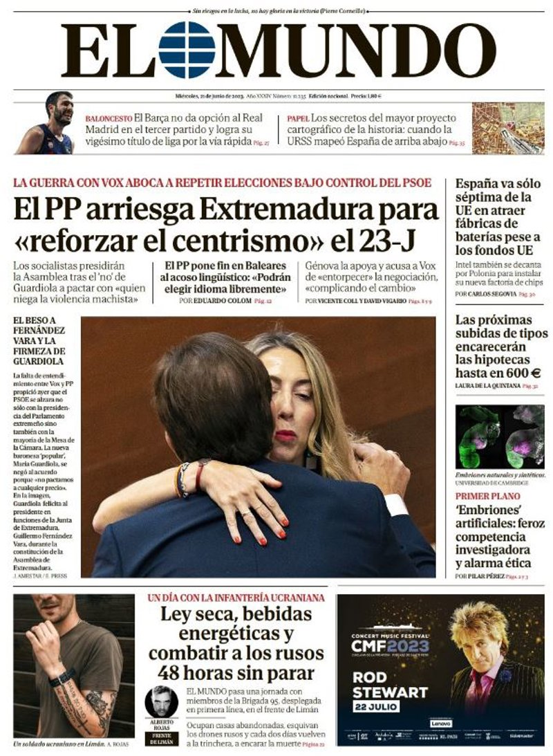EL MUNDO: "El PP arriesga Extremadura para "reforzar el centrismo" el 23-J"; "Ley seca, bebidas energéticas y combatir a los rusos 48 horas sin parar"; "España va sólo séptima de la UE en atraer fábricas de baterías pese a los fondos UE"; "Las próximas subidas de tipos encarecerán las hipotecas hasta en 600 €".