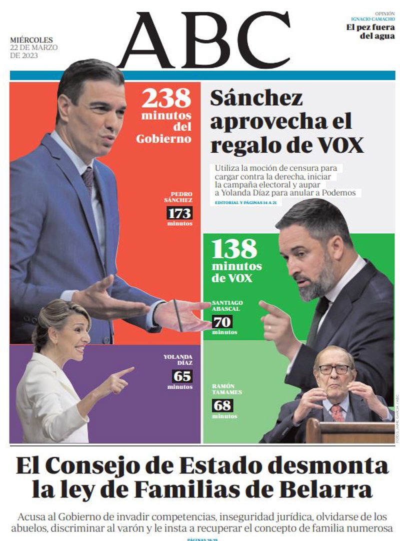 ABC: "Sánchez aprovecha el regalo de VOX. Utiliza la moción de censura para cargar contra la derecha, iniciar la campaña electoral y aupar a Yolanda Díaz para anular a Podemos"; "El Consejo de Estado desmonta la ley de Familias de Belarra. Acusa al Gobierno de invadir competencias, inseguridad jurídica, olvidarse de los abuelos, discriminar al varón y le insta a recuperar el concepto de familia numerosa".