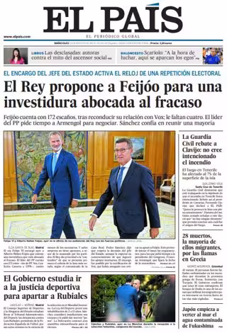 EL PAÍS: "El Rey propone a Feijóo para una investidura abocada al fracaso"; "El Gobierno estudia ir a la justicia deportiva para apartar a Rubiales"; "La Guardia Civil rebate a Clavijo: no cree intencionado el incendio"; "28 muertos, la mayoría de ellos migrantes, por las llamas en Grecia"; "Japón empieza a verter al mar el agua contaminada de Fukushima".