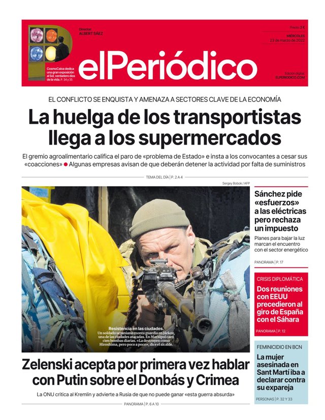 EL PERIÓDICO: "La huelga de los transportistas llega a los supermercados"; "Zelenski acepta por primera vez hablar con Putin sobre el Donbás y Crimea"; "Sánchez pide esfuerzos a las eléctricas pero rechaza un impuesto"; "Dos reuniones con EEUU precedieron al giro de España con el Sáhara"; "La mujer asesinada en Sant Martí iba a declarar contra su expareja".