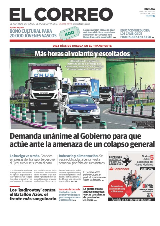 EL CORREO: "Más horas al volante y escoltados"; "Demanda unánime al Gobierno para que actúe ante la amenaza de un colapso general"; "Los 'kadirovsty' contra el Batallón Azov, el frente más sanguinario"; "La guerra atrapa a nueve empresas vascas con plantas de producción en Rusia".