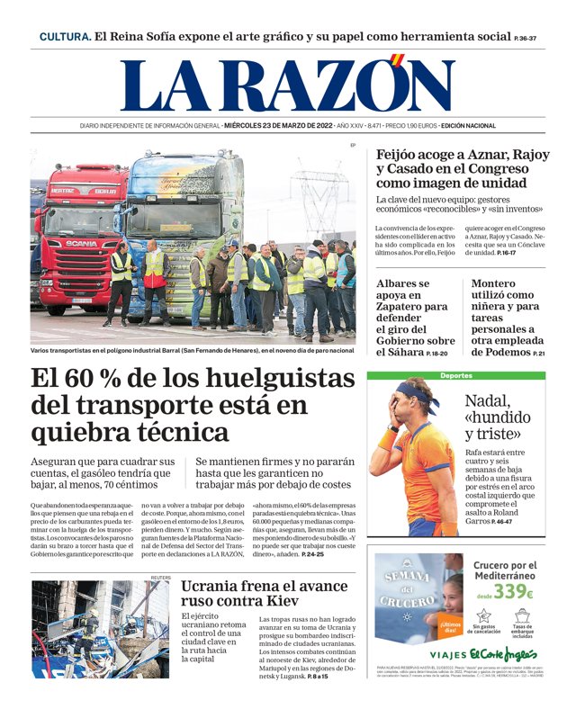 LA RAZÓN: "El 60% de los huelguistas del transporte está en quiebra técnica"; "Feijóo acoge a Aznar, Rajoy y Casado en el Congreso como imagen de unidad"; "Albares se apoya en Zapatero para defender el giro del Gobierno sobre el Sáhara"; "Montero utilizó como niñera y para tareas personales a otra empleada de Podemos"; "Ucrania frena el avance ruso contra Kiev"; "Nadal, hundido y triste".