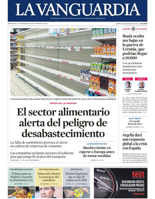 LA VANGUARDIA: "El sector alimentario alerta del peligro de desabastecimiento"; "Rusia oculta sus bajas en la guerra de Ucrania, que podrían llegar a 10.000"; "Argelia dará una respuesta global a la crisis con España".