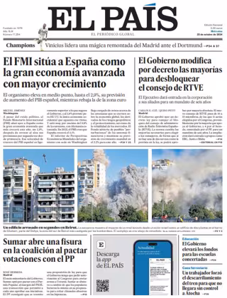 EL PAÍS: "El FMI sitúa a España como la gran economía avanzada con mayor crecimiento"; "Sumar abre una fisura en la coalición al pactar votaciones con el PP"; "El Gobierno modifica por decreto las mayorías para desbloquear el consejo de RTVE"; "El Gobierno elevará los fondos para las escuelas concertadas"; "Un trabajador forzó el descarrilamiento del tren para que no llegara sin control a Atocha".
