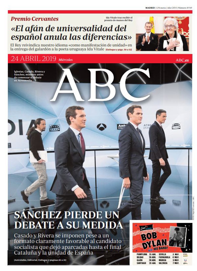 ABC: "Sánchez pierde un debate a su medida"; "Casado y Rivera se imponen pese a un formato claramente favorable al candidato socialista que dejó aparcadas hasta el final Cataluña y la unidad de España".