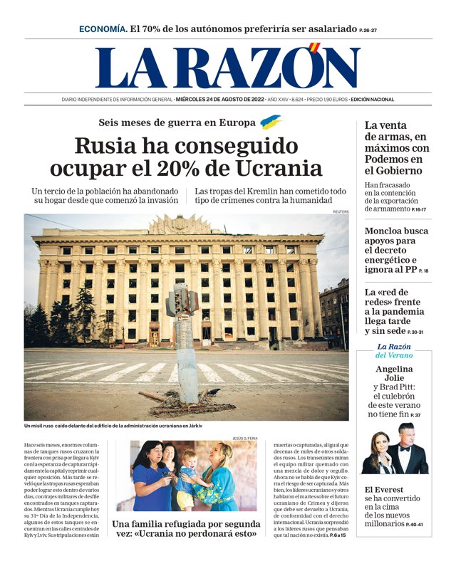 LA RAZÓN: "Rusia ha conseguido ocupar el 20% de Ucrania"; "La venta de armas, en máximos con Podemos en el Gobierno"; "Moncloa busca apoyos para el decreto energético e ignora al PP"; "La red de redes frente a la pandemia llega tarde y sin sede".