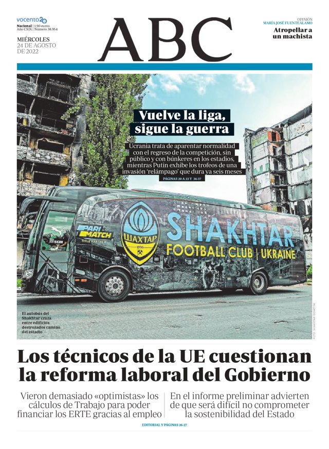 ABC: "Vuelve la liga, sigue la guerra"; "Los técnicos de la UE cuestionan la reforma laboral del Gobierno".