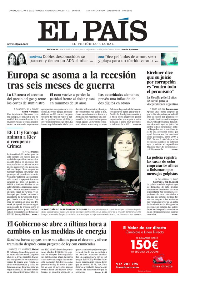EL PAÍS: "Europa se asoma a la recesión tras seis meses de guerra"; "Kirchner dice que su juicio por corrupción es contra todo el peronismo"; "EE UU y Europa animan a Kiev a recuperar Crimea"; "La policía registra las casas de ocho empresarios afines a Bolsonaro por mensajes golpistas"; "El Gobierno se abre a última hora a cambios en las medidas de energía".
