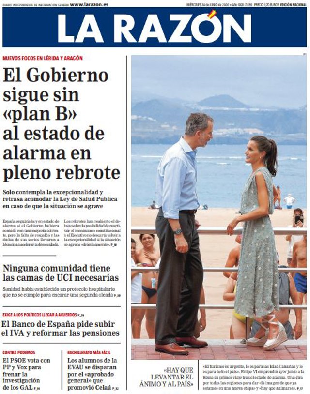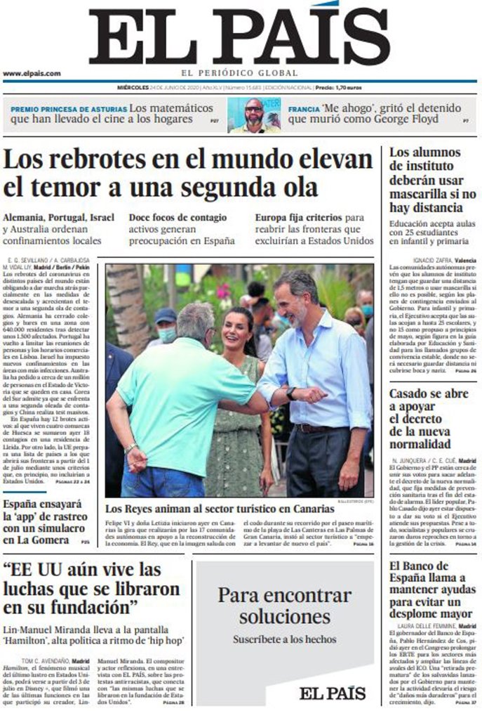 EL PAÍS: "Los rebrotes en el mundo elevan el temor a una segunda ola"; "España ensayará la 'app' de rastreo con un simulacro en La Gomera"; ""EE UU aún vive las luchas que se libraron en su fundación. Lin-Manuel Miranda lleva a la pantalla 'Hamilton', alta política a ritmo de 'hip hop'"; "Los alumnos de instituto deberán usar mascarilla si no hay distancia"; "Casado se abre a apoyar el decreto de la nueva normalidad"; "El Banco de España llama a mantener ayudas para evitar un desplome mayor".