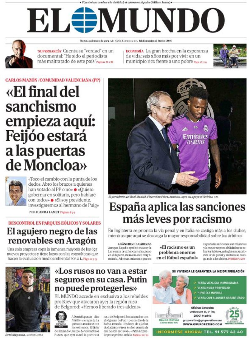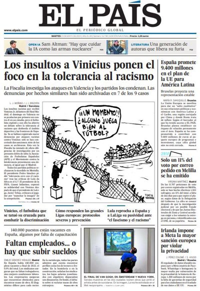 EL PAÍS: "Los insultos a Vinicius ponen el foco en la tolerancia al racismo"; "España promete 9.400 millones en el plan de la UE para América Latina"; "Solo un 11% del voto por correo pedido en Melilla se ha emitido"; "Irlanda impone a Meta la mayor sanción europea por violar la privacidad"; "Faltan empleados... o hay que subir sueldos".