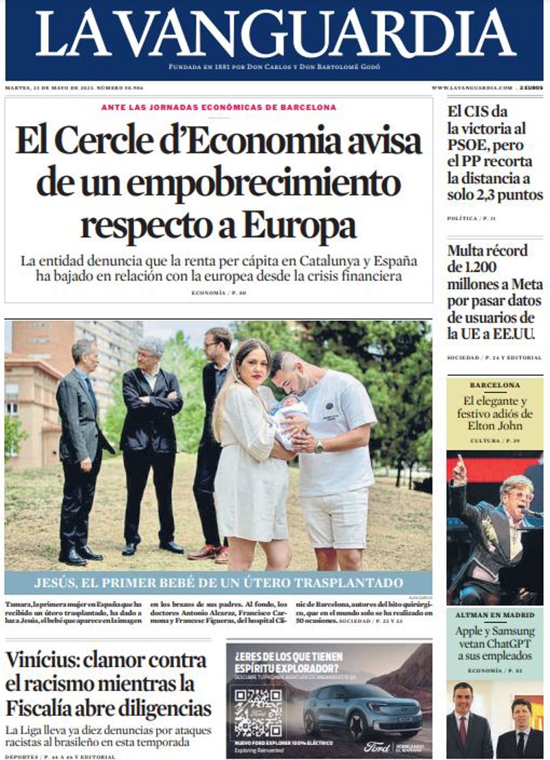 LA VANGUARDIA: "El Cercle d'Economia avisa de un empobrecimiento respecto a Europa"; "Vinícius:clamor contra el racismo mientras la Fiscalía abre diligencias"; "Jesús, el primer bebé de un útero trasplantado"; "ElCIS da la victoria al PSOE, pero el PP recorta la distancia a solo 2,3 puntos"; "Multa récord de 1.200 millones a Meta por pasar datos de usuarios de la UE a EE.UU.".