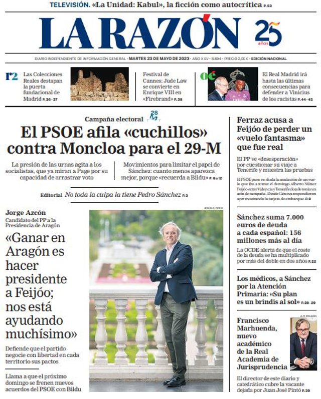 LA RAZÓN: "El PSOE afila cuchillos contra Moncloa para el 29-M"; "Ferraz acusa a Feijóo de perder un vuelo fantasma que fue real"; "Los médicos, a Sánchez por la Atención Primaria: Su plan es un brindis al sol"; "Francisco Marhuenda, nuevo académico de la Real Academia de Jurisprudencia"; "Azcón: Ganar en Aragón es hacer presidente a Feijóo; nos está ayudando muchísimo".