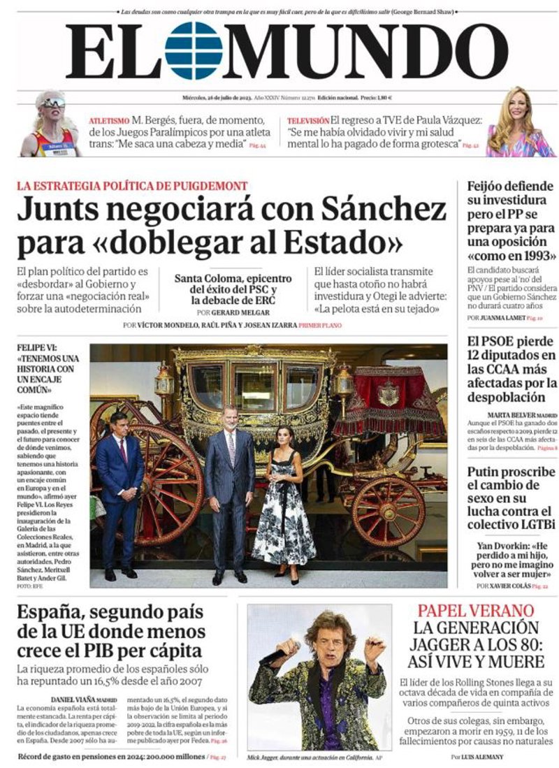 EL MUNDO: "Junts negociará con Sánchez para "doblegar al Estado""; "España, segundo país de la UE donde menos crece el PIB per cápita"; "Feijóo defiende su investidura pero el PP se prepara ya para una oposición "como en 1993""; "El PSOE pierde 12 diputados en las CCAA más afectadas por la despoblación"; "Putin proscribe el cambio de sexo en su lucha contra el colectivo LGTBI".