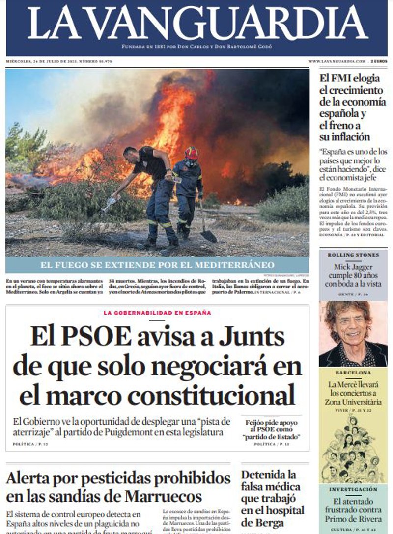 LA VANGUARDIA: "El PSOE avisa a Junts de que solo negociará en el marco constitucional"; "Alerta por pesticidas prohibidos en las sandías de Marruecos"; "El FMI elogia el crecimiento de la economía española y el freno a su inflación"; "Detenida la falsa médica que trabajó en el hospital de Berga".