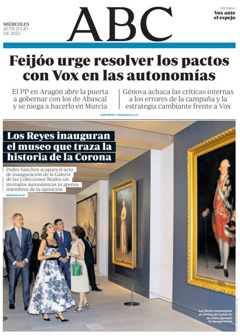 ABC: "Feijóo urge resolver los pactos con Vox en las autonomías"; "Los Reyes inauguran el museo que traza la historia de la Corona".