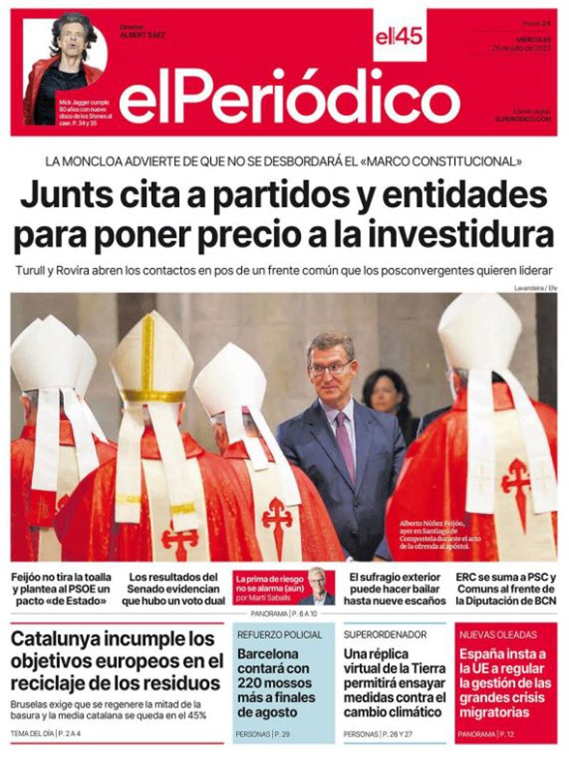 EL PERIÓDICO: "Junts cita a partidos y entidades para poner precio a la investidura"; "Catalunya incumple los objetivos europeos en el reciclaje de los residuos"; "Barcelona contará con 220 mossos más a finales de agosto"; "Una réplica virtual de la Tierra permitirá ensayar medidas contra el cambio climático"; "España insta a la UE a regular la gestión de las grandes crisis migratorias".