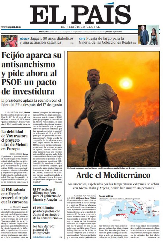 EL PAÍS: "Feijóo aparca su antisanchismo y pide ahora al PSOE un pacto de investidura"; "Arde el Mediterráneo"; "La debilidad de Vox trastoca el proyecto ultra de Meloni en Europa"; "El FMI calcula que España crecerá el triple que la eurozona".