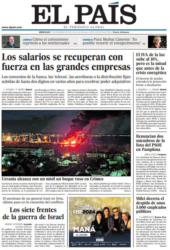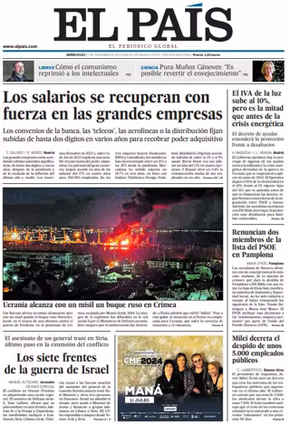 EL PAÍS: "Los salarios se recuperan con fuerza en las grandes empresas"; "Los siete frentes de la guerra de Israel"; "El IVA de la luz sube al 10%, pero es la mitad que antes de la crisis energética"; "Renuncian dos miembros de la lista del PSOE en Pamplona"; "Milei decreta el despido de unos 5.000 empleados públicos".