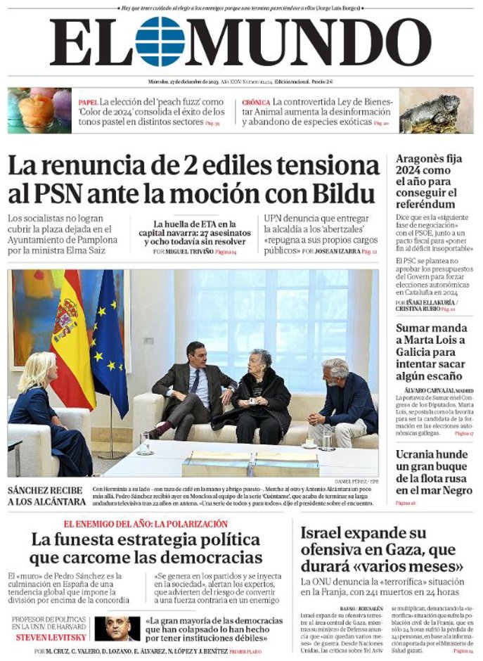 EL MUNDO: "La renuncia de 2 ediles tensiona al PSN ante la moción con Bildu"; "La funesta estrategia política que carcome las democracias"; "Aragonès fija 2024 como el año para conseguir el referéndum"; "Sumar manda a Marta Lois a Galicia para intentar sacar algún español"; "Ucrania hunde un gran buque de la flota rusa en el mar Negro"; "Israel expande su ofensiva en Gaza, que durará "varios meses"".