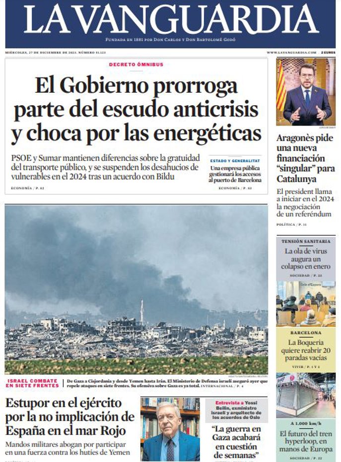 LA VANGUARDIA: "El Gobierno prorroga parte del escudo anticrisis y choca por las energéticas"; "Estupor en el ejército por la no implicación de España en el mar Rojo"; "Aragonès pide una nueva financiación "singular" para Catalunya".