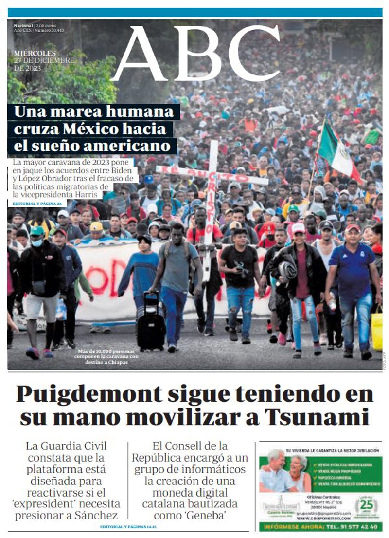 ABC: "Una marea humana cruza México hacia el sueño americano"; "Puigdemont sigue teniendo en su mano movilizar a Tsunami".