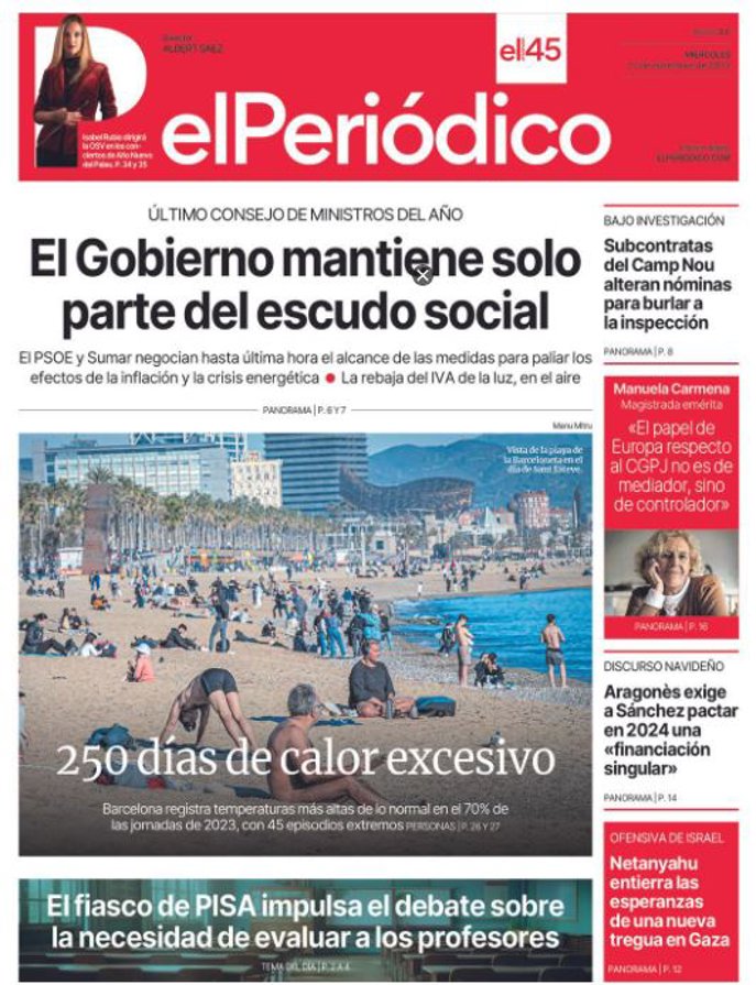 EL PERIÓDICO: "El Gobierno mantiene solo parte del escudo social"; "250 días de calor excesivo"; "El fiasco de PISA impulsa el debate sobre la necesidad de evaluar a los profesores"; "Subcontratas del Camp Nou alteran las nóminas para burlas a la inspección"; "Manuela Carmena: "El papel de Europa respecto al CGPJ no es de mediador, sino controlador"; "Aragonès exige a Sánchez pactar en 2024 una "financiación singular""; "Netanyahu entierra las esperanzas de una nueva tregua en Gaza".