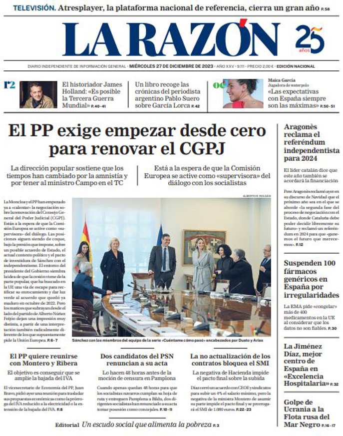 LA RAZÓN: "El PP exige empezar desde cero para renovar el CGPJ"; "Aragonès reclama el referéndum independentista para 2024"; "Suspenden 100 fármacos genéricos en España por irregularidades"; "La Jiménez Díaz, mejor centro de España en "Excelencia Hospitalaria""; "Golpe de Ucrania a la Flota rusa del Mar Negro".