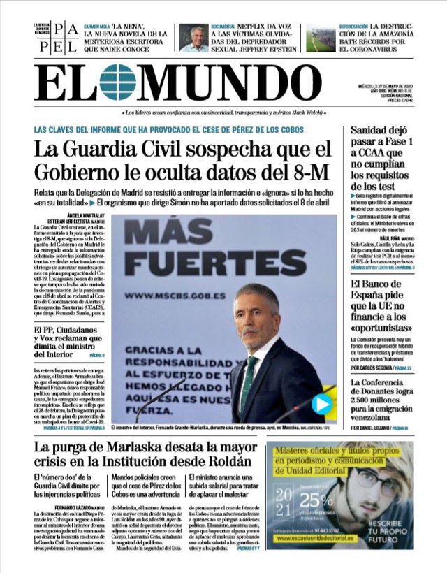 EL MUNDO: "La Guardia Civil sospecha que el Gobierno le oculta datos del 8-M. El PP, Ciudadanos y Vox reclaman que dimita el ministro del Interior"; "La purga de Marlaska desata la mayor crisis en la Institución desde Roldán"; "Sanidad dejó pasar a Fase 1 a CCAA que no cumplían los requisitos de los test"; "El Banco de España pide que la UE no financie a los "oportunistas""; "La Conferencia de Donantes logra 2.500 millones para la emigración venezolana".