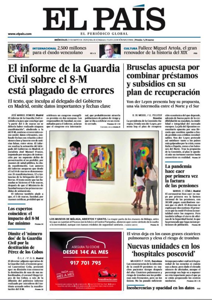 EL PAÍS: "El informe de la Guardia Civil sobre el 8-M está plagado de errores"; "Bruselas apuesta por combinar préstamos y subsidios en su plan de recuperación"; "Los museos de Málaga, abiertos y gratis"; "Los expertos coinciden: el impacto del 8-M fue mínimo. Dimite el 'número dos' de la Guardia Civil por la destitución de Pérez de los Cobos"; "Nuevas unidades en los 'hospitales poscovid'. Incoherencias y opacidad en los datos"; "La pandemia hace caer por primera vez la factura de las pensiones".