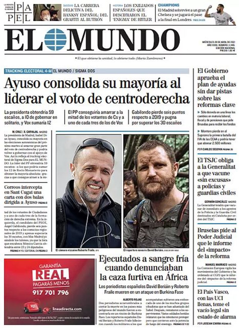 EL MUNDO: "Ayuso consolida su mayoría al liderar el voto de centroderecha"; "Ejecutados a sangre fría cuando denunciaban la caza furtiva en África"; "El Gobierno aprueba el plan de ayudas sin dar pistas sobre las reformas clave"; "El TSJC obliga a la Generalitat a que vacune "sin excusas" a policías y guardias civiles"; "Bruselas pide al Poder Judicial que le informe del "impacto" de la reforma"; "El País Vasco, con las UCI llenas, teme el vacío legal si estado de alarma".