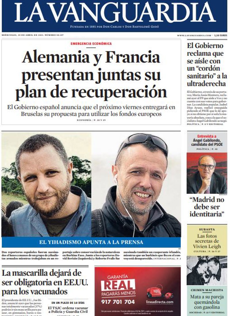 LA VANGUARDIA: "Alemania y Francia presentan juntas su plan de recuperación"; "La mascarilla dejará de ser obligatoria en EE.UU. para los vacunados"; "El Gobierno reclama que se aísle con un "cordón sanitario" a la ultraderecha"; "Entrevista a Ángel Gabilondo, candidato del PSOE: ""Madrid no debe ser identitaria"".