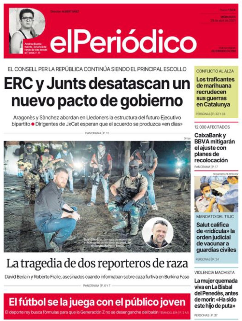 EL PERIÓDICO: "ERC y Junts desatascan un nuevo pacto de gobierno"; "La tragedia de dos reporteros de raza"; "El fútbol se la juega con el público joven"; "Los traficantes de marihuana recrudecen sus guerras en Catalunya"; "CaixaBank y BBVA mitigarán el ajuste con planes de recolocación"; "Salut califica de "ridícula" la orden judicial de vacunar a los guardias civiles"; "La mujer quemada viva en La Bisbal del Penedès, antes de morir: "Ha sido este hijo de puta"".