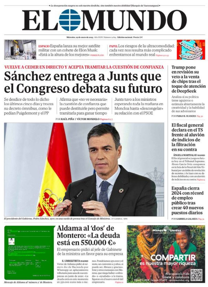 EL MUNDO: "Sánchez entrega a Junts que el Congreso debata su futuro"; "Aldama al 'dos' de Montero: "La deuda está en 550.000 euros"; "Trump pone en revisión su veto a la venta de chips tras el toque de atención de DeepSeek"; "El fiscal general declara en el TS frente al aluvión de indicios de la filtración en su contra"; "España cierra 2024 con récord de empleo público tras crear 40 nuevos puestos diarios".