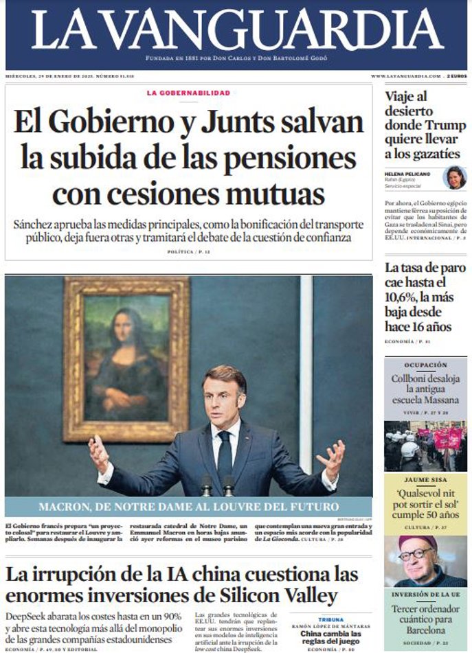 LA VANGUARDIA: "El Gobierno y Junts salvan la subida de las pensiones con cesiones mutuas"; "La irrupción de la IA china cuestiona las enormes inversiones de Silicon Valley"; "Viaje al desierto dondeTrump quiere llevar a los gazatíes"; "La tasa de paro caehasta el 10,6%,lamás bajadesde hace 16 años".