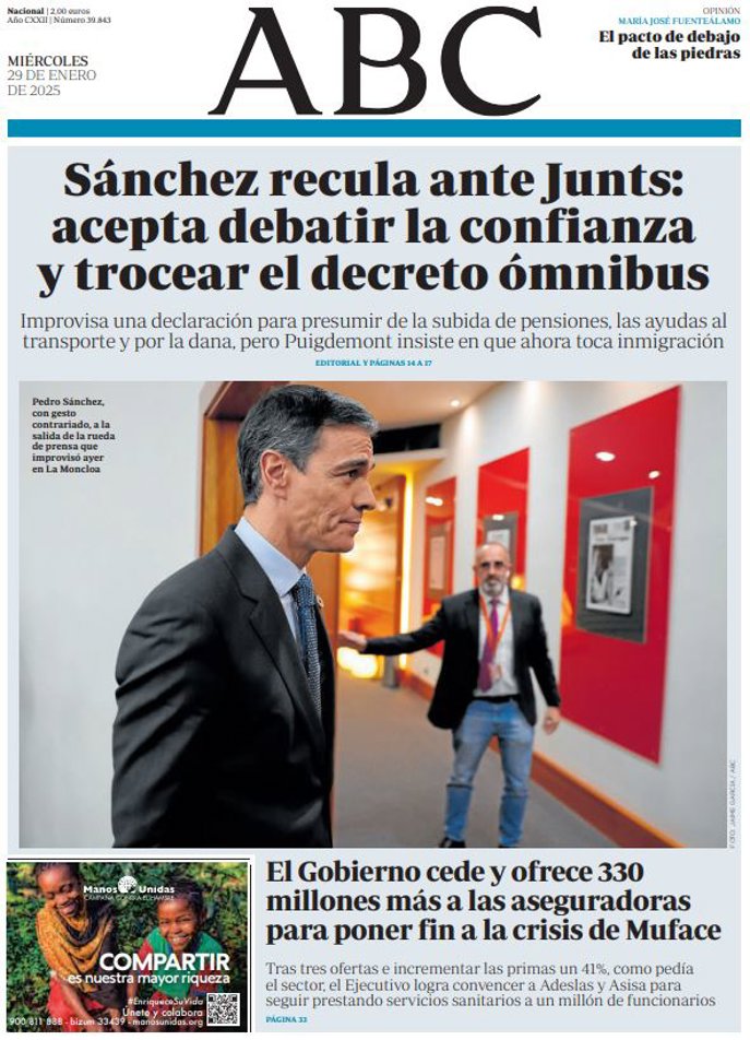 ABC: "Sánchez recula ante Junts: acepta debatir la confianza y trocear el decreto ómnibus"; "El Gobierno cede y ofrece 330 millones más a las aseguradoras para poner fin a la crisis de Muface".