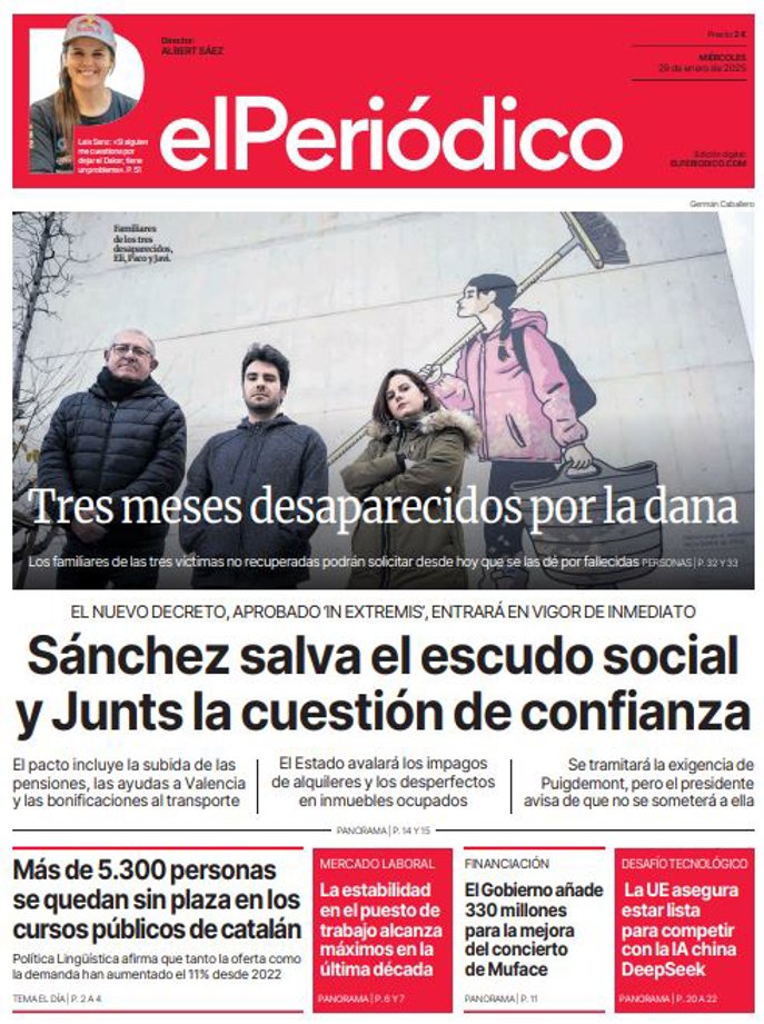 EL PERIÓDICO: "Sánchez salva el escudo social y Junts la cuestión de confianza"; "Más de 5.300 personas se quedan sin plaza en los cursos públicos de catalán"; "La estabilidad en el puesto de trabajo alcanza máximos en la última década"; "El Gobierno añade 330 millones para la mejora del concierto de Muface"; "La UE asegura estar lista para competir con la IA china DeepSeek".