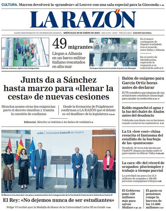LA RAZÓN: "Junts da a Sánchez hasta marzo para "llenar la cesta" de nuevas cesiones"; "El Rey: "No dejemos nunca de ser estudiantes""; "Balón de oxígeno para García Ortiz horas antes de declarar"; "Koldo enganchó el agua y la luz del chalet de Ábalos antes del desahucio"; "La IA "low cost" china resucita el fantasma del estallido de la burbuja de las "puntocom"": "La cara "B" del récord de ocupados: pluriempleo y trabajo a tiempo parcial"; "El Gobierno pone 330 millones más para salvar Muface"; "El gasto en pensiones rompe la barrera de los 13.000 millones".