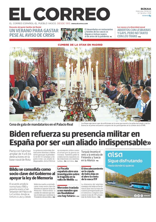 EL CORREO: "Biden refuerza su presencia militar en España por ser un aliado indispensable"; "Bildu se consolida como socio clave del Gobierno al apoyar la ley de Memoria"; "La Fiscalía española abre una investigación sobre la tragedia en la valla de Melilla"; "Mercedes traslada a sus mandos que sin flexibilidad no hay futuro"; "El descabezamiento en la cúpula de Indra deja en el alero la venta de la vasca ITP".
