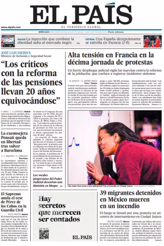 EL PAÍS: "José Luis Escrivá, ministro de Inclusión y Seguridad Social: "Los críticos con la reforma de las pensiones llevan 20 años equivocándose""; "Alta tensión en Francia en la décima jornada de protestas"; "La exconsejera Ponsatí queda en libertad tras volver a Barcelona"; "El Supremo anula el cese de Pérez de los Cobos en la Guardia Civil"; "39 migrantes detenidos en México mueren en un incendio".