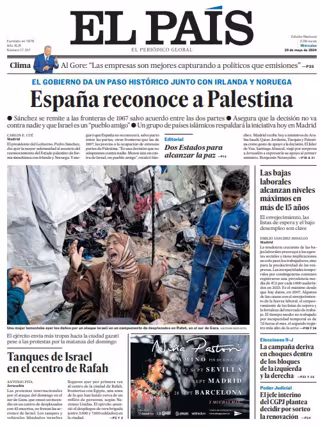 EL PAÍS: "España reconoce a Palestina"; "Tanques de Israel en el centro de Rafah"; "Las bajas laborales alcanzan niveles máximos en más de 15 años"; "La campaña deriva en choques dentro de los bloques de la izquierda y la derecha"; "El jefe interino del CGPJ plantea decidir por sorteo la renovación".