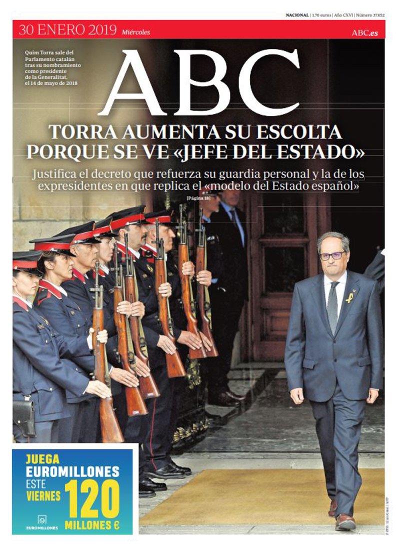 ABC: "Torra aumenta su escolta porque se ve 'jefe del Estado'"; "Justifica el decreto que refuerza su guardia personal y la de los expresidentes en que replica el 'modelo del Estado español'".