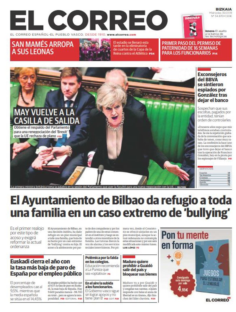 EL CORREO: "El Ayuntamiento de Bilbao da refugio a toda una familia en un caso extremo de 'bullying'"; "Exconsejeros del BBVA se sintieron espiados por González tras dejar el banco"; "Euskadi cierra el año con la tasa más baja de paro de España por el empleo público"; "Maduro quiere prohibir a Guaidó salir del país y bloquear sus bienes".
