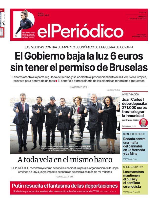 EL PERIÓDICO: "El Gobierno baja la luz 6 euros sin tener el permiso de Bruselas"; "A toda vela en el mismo barco"; "Juan Carlos I debe depositar 271.000 euros tras no lograr la inmunidad"; "Redada contra una mafia del cannabis en La Verneda y La Mina"; "Los maestros mantienen el pulso y el conflicto se enquista"; "Putin resucita el fantasma de las deportaciones".