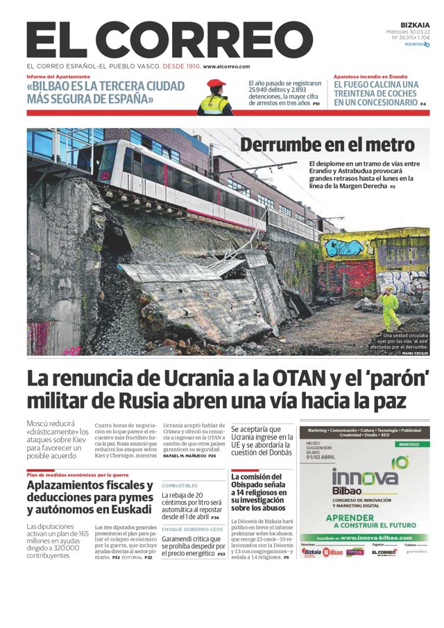 EL CORREO: "La renuncia de Ucrania a la OTAN y el parón militar de Rusia abren una vía hacia la paz"; "Aplazamientos fiscales y deducción para pymes y autónomos en Euskadi"; "Derrumbe en el metro".