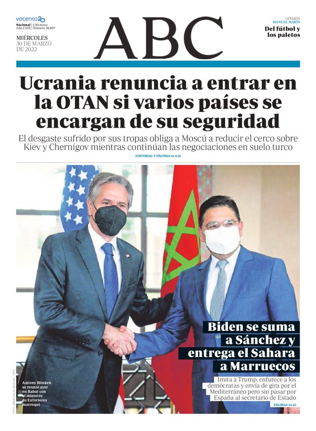 ABC: "Ucrania renuncia a entrar en la OTAN si varios países se encargan de su seguridad"; "Biden se suma a Sánchez y entrega el Sáhara a Marruecos".