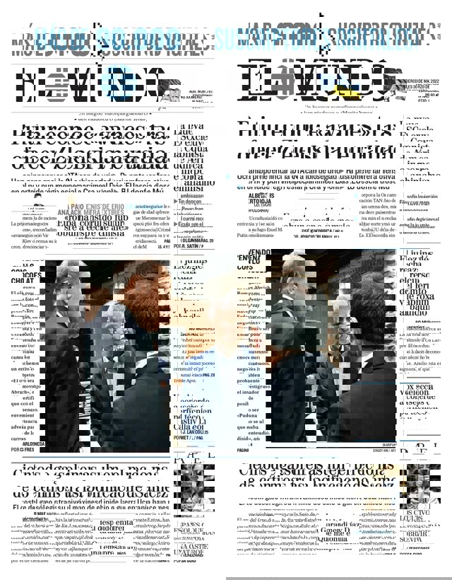EL MUNDO: "Putin reconoce 'avances' tras ofrecer Zelenski la neutralidad"; "La nueva ESO excluye la Conquista de América e incorpora el animalismo"; "El juez inglés rechaza el recurso del Emérito y le aproxima al banquillo"; "Vox selecciona a consejeros de perfil técnico en Castilla y León"; "Cientos de gasolineras suben el precio más de 5 céntimos tras la bonificación de Sánchez".