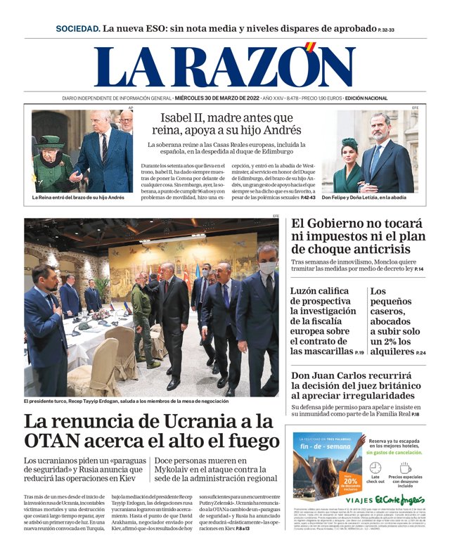 LA RAZÓN: "Isabel II, madre antes que reina, apoya a su hijo Andrés"; "El Gobierno no tocará ni impuestos ni el plan de choque anticrisis"; "Luzón califica de prospectiva la investigación de la fiscalía europea sobre el contrato de las mascarillas"; "Los pequeños caseros, abocados a subir solo un 2% los alquileres"; "Don Juan Carlos recurrirá la decisión del juez británico al apreciar irregularidades"; "La renuncia de Ucrania a la OTAN acerca el alto el fuego".