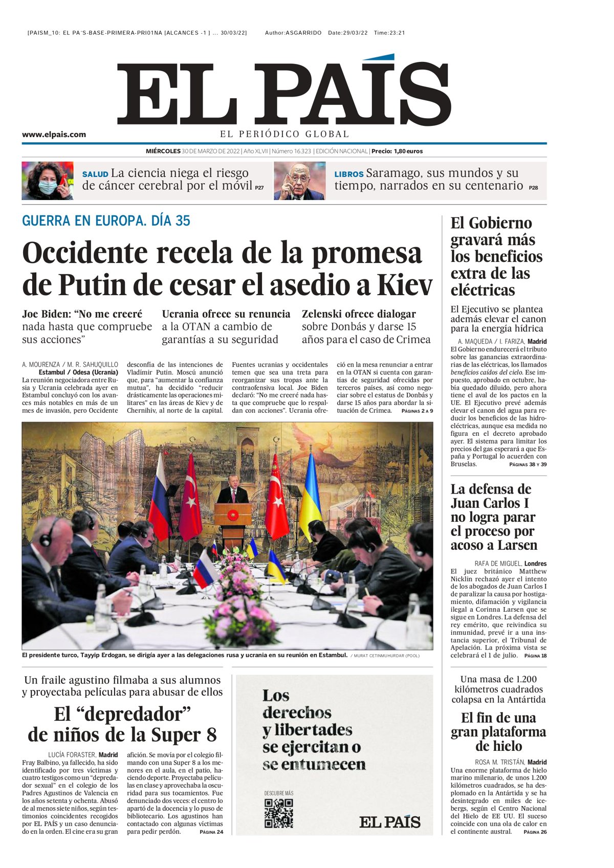 EL PAÍS: "Occidente recela de la promesa de Putin de cesar el asedio a Kiev"; "El Gobierno gravará más los beneficios extra de las eléctricas"; "La defensa de Juan Carlos I no logra parar el proceso por acoso a Larsen"; "El depredador de niños de la Super 8".