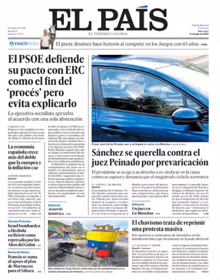 EL PAÍS: "El PSOE defiende su pacto con ERC como el fin del 'procés' pero evita explicarlo"; "La economía española crece más del doble que la europea y la inflación cae"; "Sánchez se querella contra el juez Peinado por prevaricación"; "El chavismo trata de reprimir una protesta masiva"; "Israel bombardea a Hezbolá en Beirut como represalia por los Altos del Golán"; "Francia se suma al apoyo al plan de Marruecos para el Sáhara".
