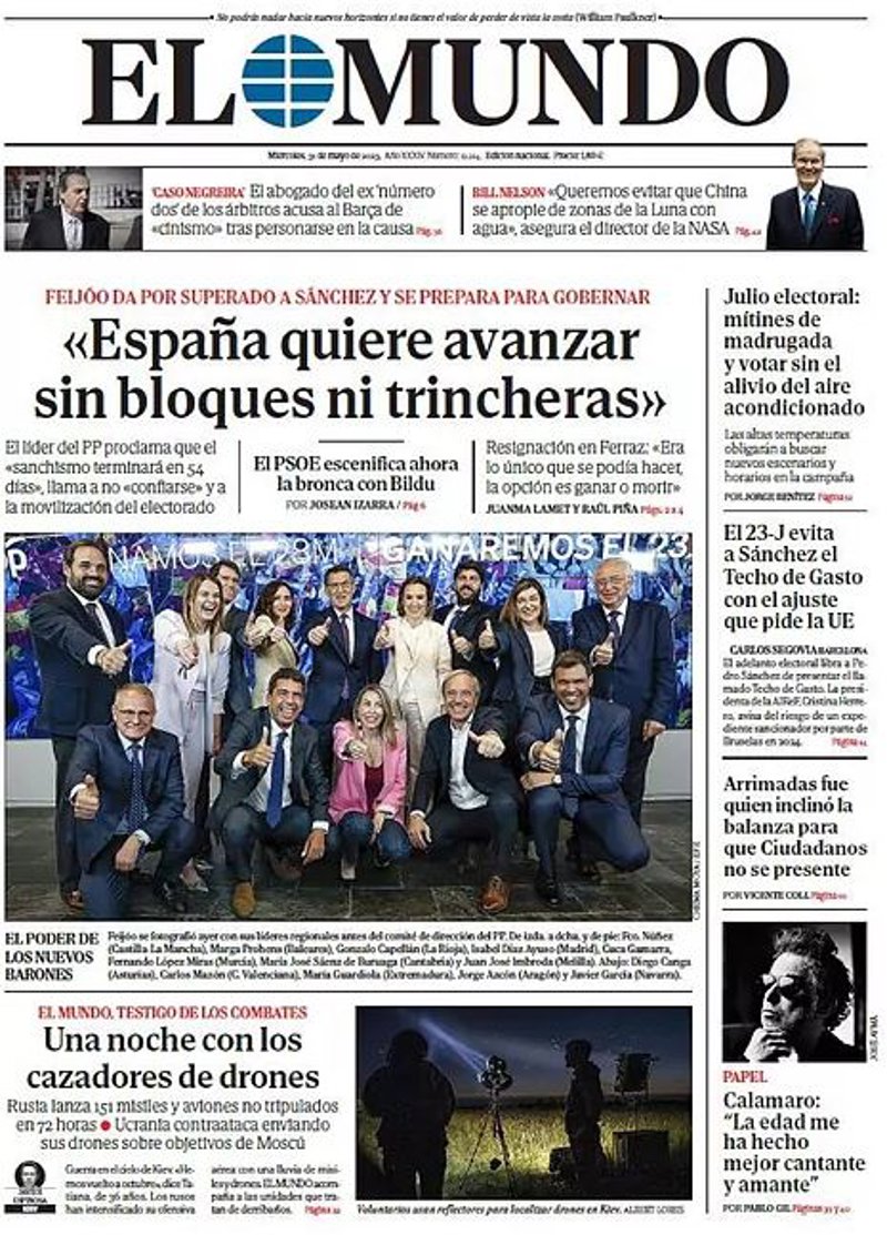 EL MUNDO: ""España quiere avanzar sin bloques ni trincheras""; "Una noche con los cazadores de drones"; "Julio electoral: mítines de madrugada y votar sin el alivio del aire acondicionado"; "El 23J evita a Sánchez el Techo de Gasto con el ajuste que pide la UE"; "Arrimadas fue quien inclinó la balanza para que Ciudadanos no se presente".